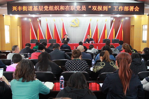 | 4月12日,兴丰街道召开基层党组织和在职党员“双报到”工作部署会。机关各科室负责人、各社区党组织书记及党务工作者40余人参加会议。