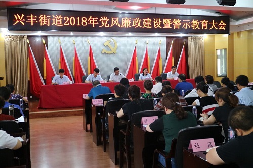 | 7月4日上午,兴丰街道召开2018年党风廉政建设暨警示教育大会,安排部署2018年党风廉政建设工作,街道领导班子成员、机关副科级以上领导干部和社区两委班子成员、非公企业党组织负责人等100余人参加此次会议。